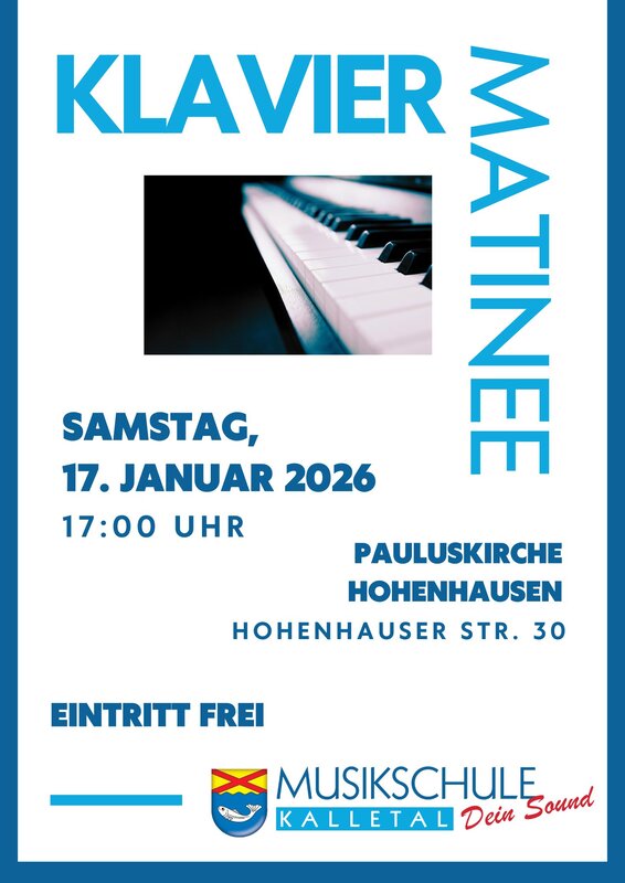 Die Musikschule Kalletal lädt herzlich zur Klavier-Matinee in die Pauluskirche Hohenhausen ein.