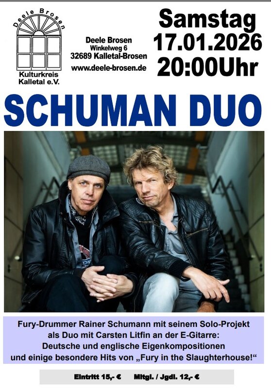 Der Kulturkreis Kalletal e.V. präsentiert den charismatischen Fury in the Slaughterhouse Drummer Rainer Schumann mit seinem Solo-Projekt Schumann Duo zusammen mit Carsten Litfin - handgemachte, intensive Songs auf englisch und deutsch und ein paar Hits von Fury sind auch im Gepäck!